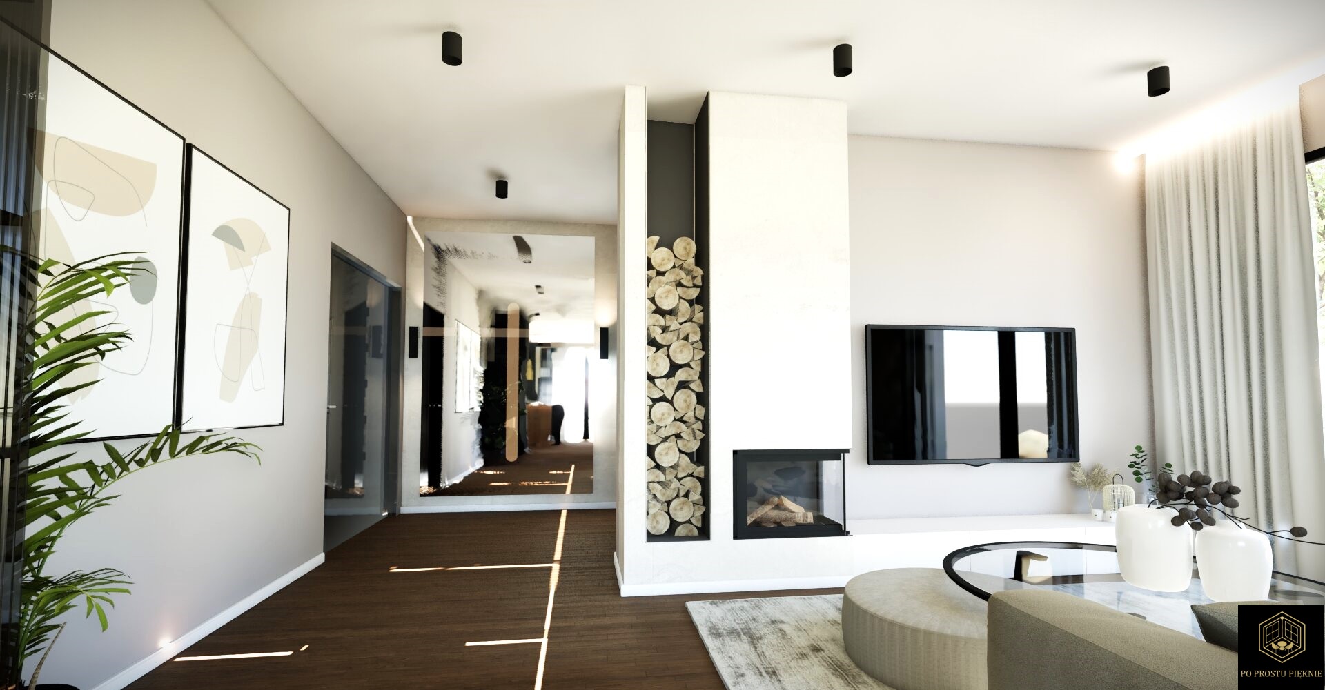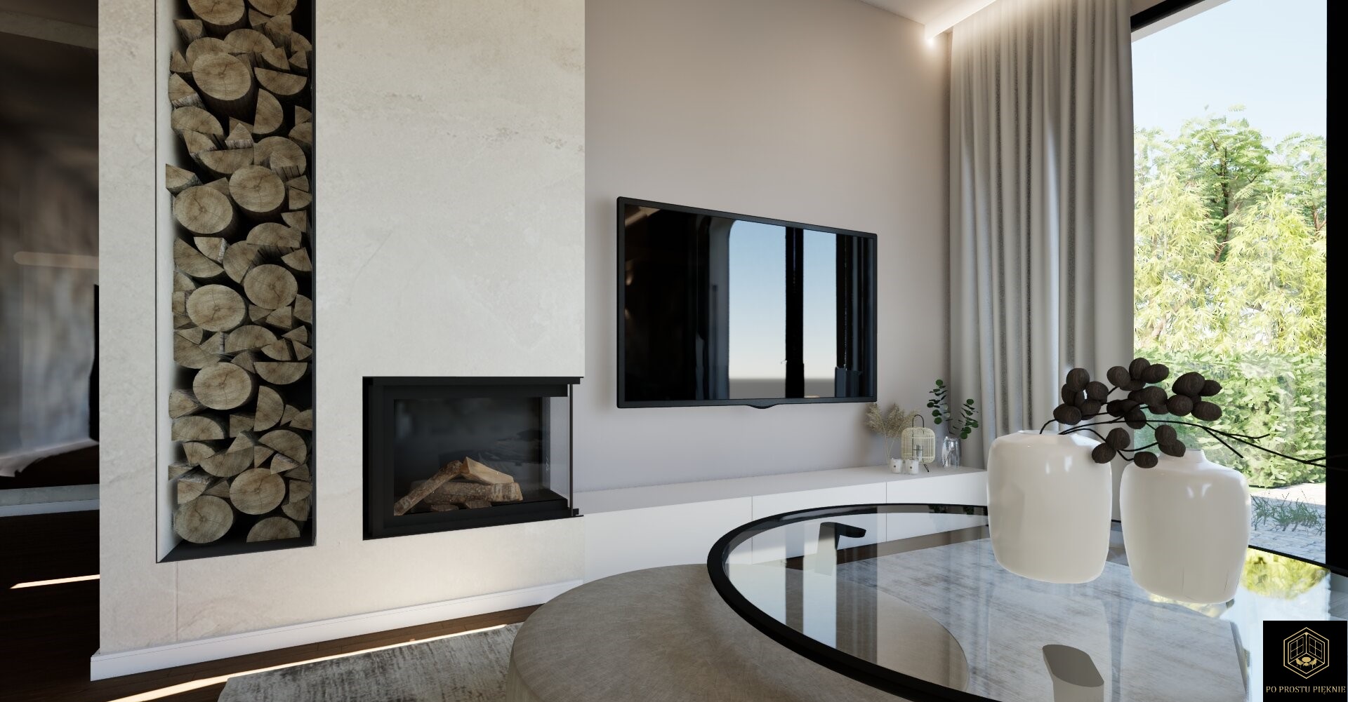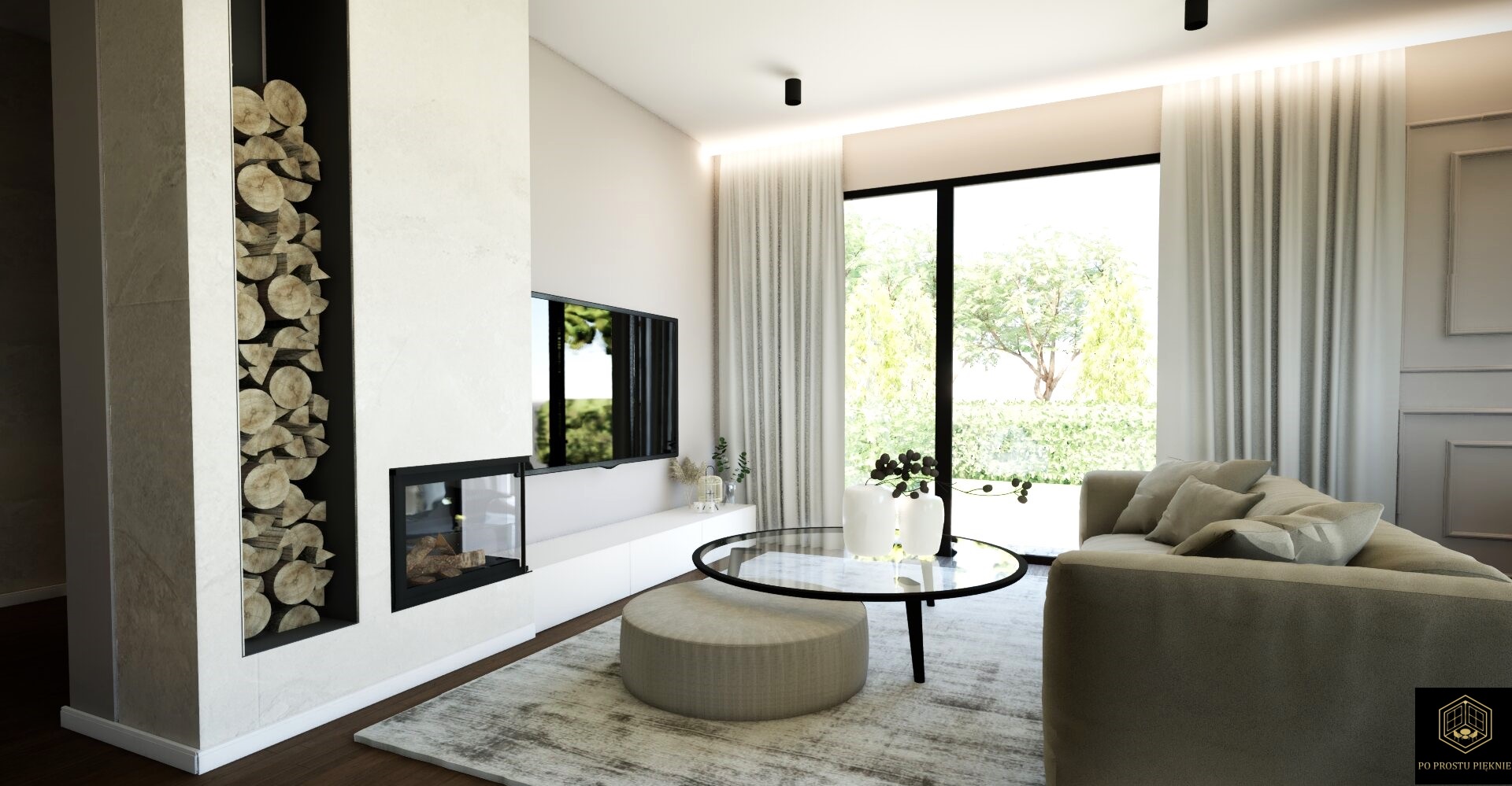 Kominek pokryty jasnym, dekoracyjnym tynkiem stanowi centralny punkt salonu. Zaprojektowany z myślą o funkcjonalności, posiada miejsce na przechowywanie drewna, co nie tylko ułatwia dostęp do opału, ale również dodaje wnętrzu rustykalnego uroku.