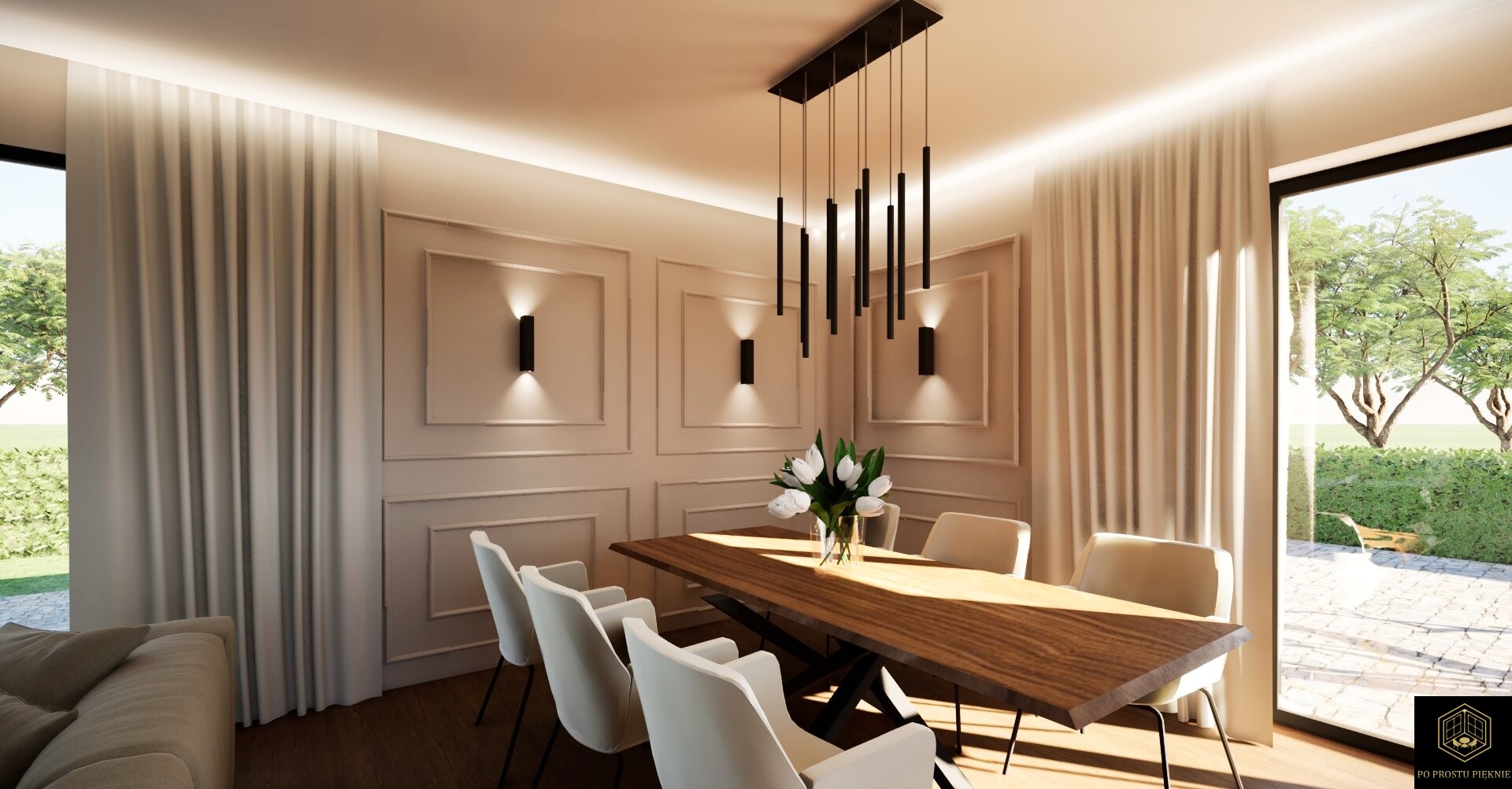 Ściany jadalni zdobi subtelna sztukateria, która dodaje wnętrzu klasy i elegancji. Ozdobne oświetlenie podkreśla detale architektoniczne, tworząc przytulną atmosferę sprzyjającą wspólnym posiłkom i rozmowom.