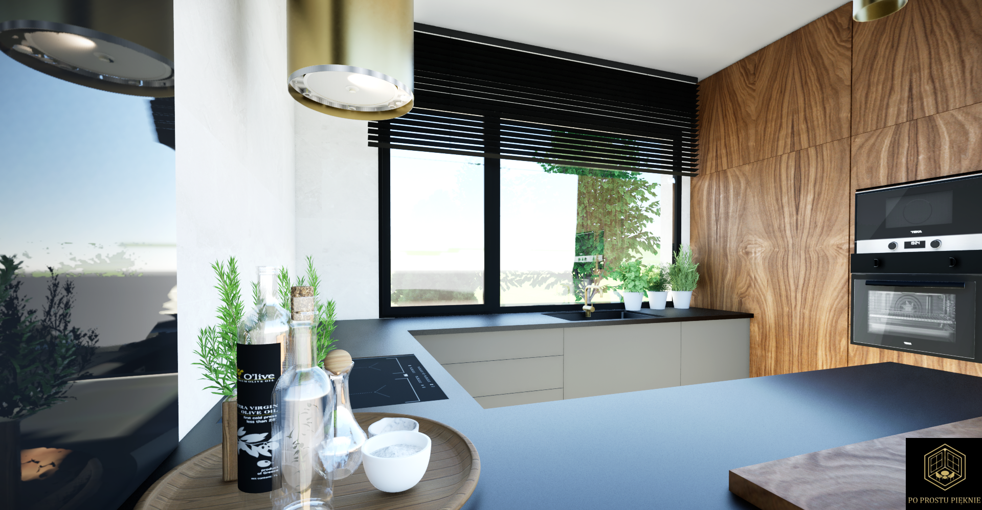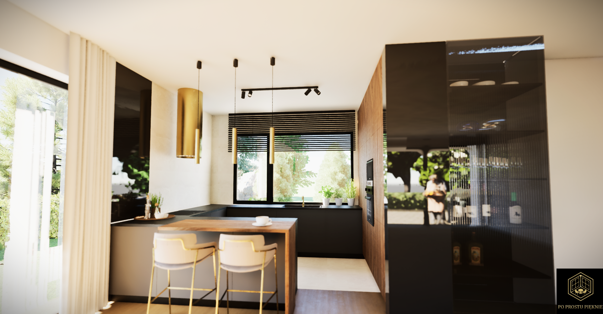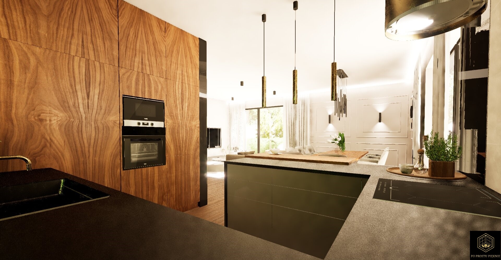 Centralnym punktem kuchni jest wyspa, na której umieszczono drewniany blat kontrastujący z ciemnymi powierzchniami. Ten naturalny element wprowadza ciepło i przytulność, a jednocześnie stanowi praktyczne miejsce do przygotowywania posiłków czy wspólnego spędzania czasu.
