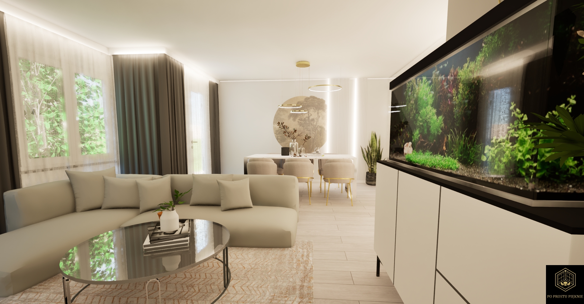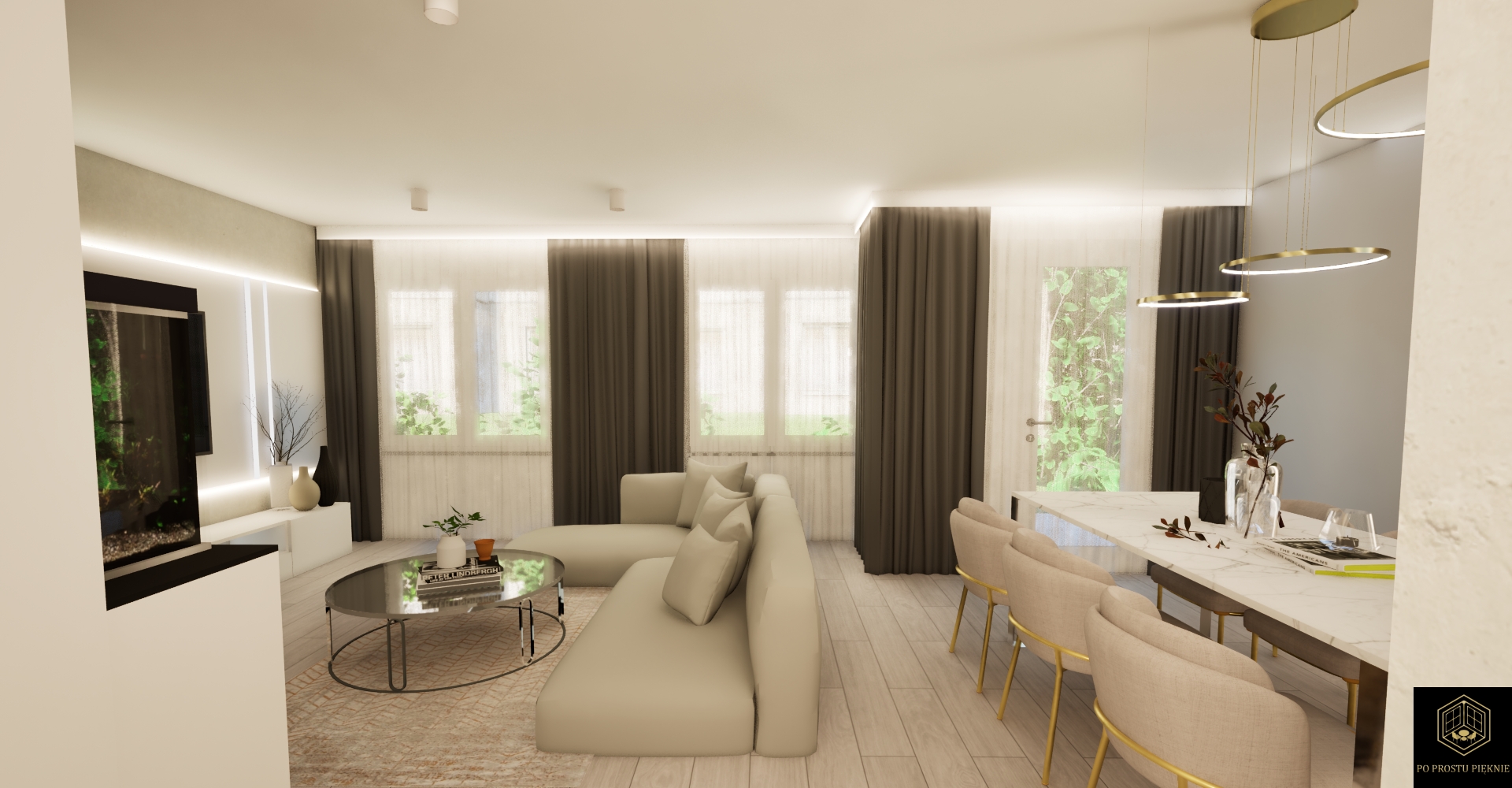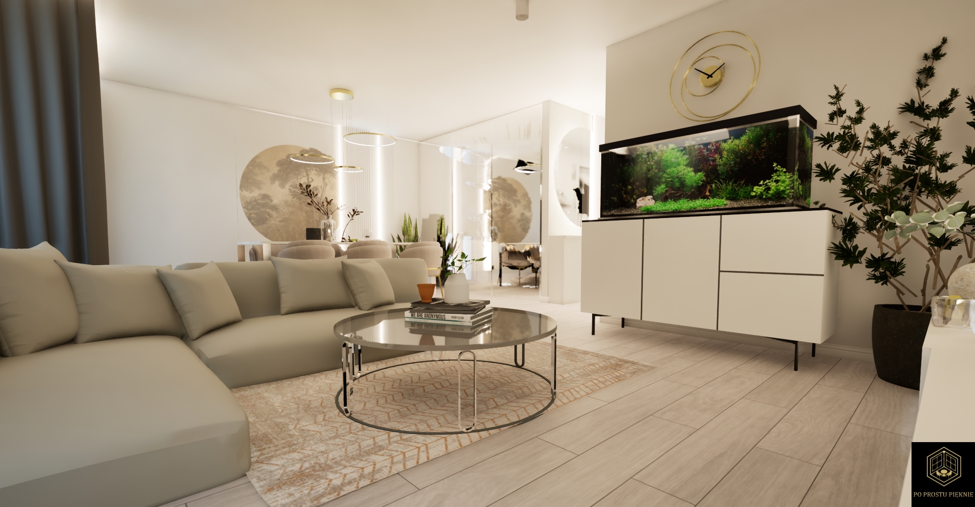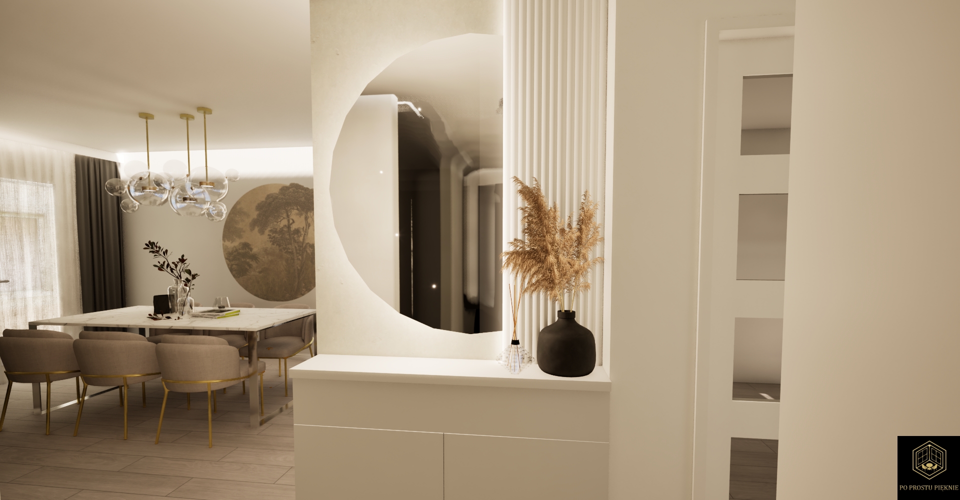 Projekt tego nowoczesnego mieszkania to wyjątkowe połączenie minimalizmu, funkcjonalności i estetyki, utrzymane w ciepłej, jasnej tonacji. Dominują tu beże, złote dodatki oraz lustra i LED-owe oświetlenie, które wspólnie tworzą spójną, pełną harmonii przestrzeń. Wnętrze jest nie tylko estetyczne, ale przede wszystkim komfortowe, przemyślane i idealne do codziennego życia.