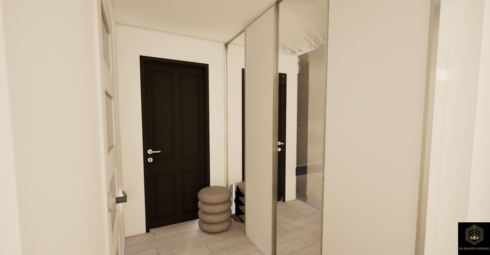 W przedpokoju zaplanowano dużą, pojemną szafę z lustrzanymi frontami, zapewniającą dużo miejsca do przechowywania odzieży wierzchniej, butów i dodatków. Naprzeciwko wejścia znajduje się stylowa szafka z dużym lustrem, która nie tylko spełnia funkcję dekoracyjną, ale też pomaga w codziennym przygotowaniu do wyjścia z domu.