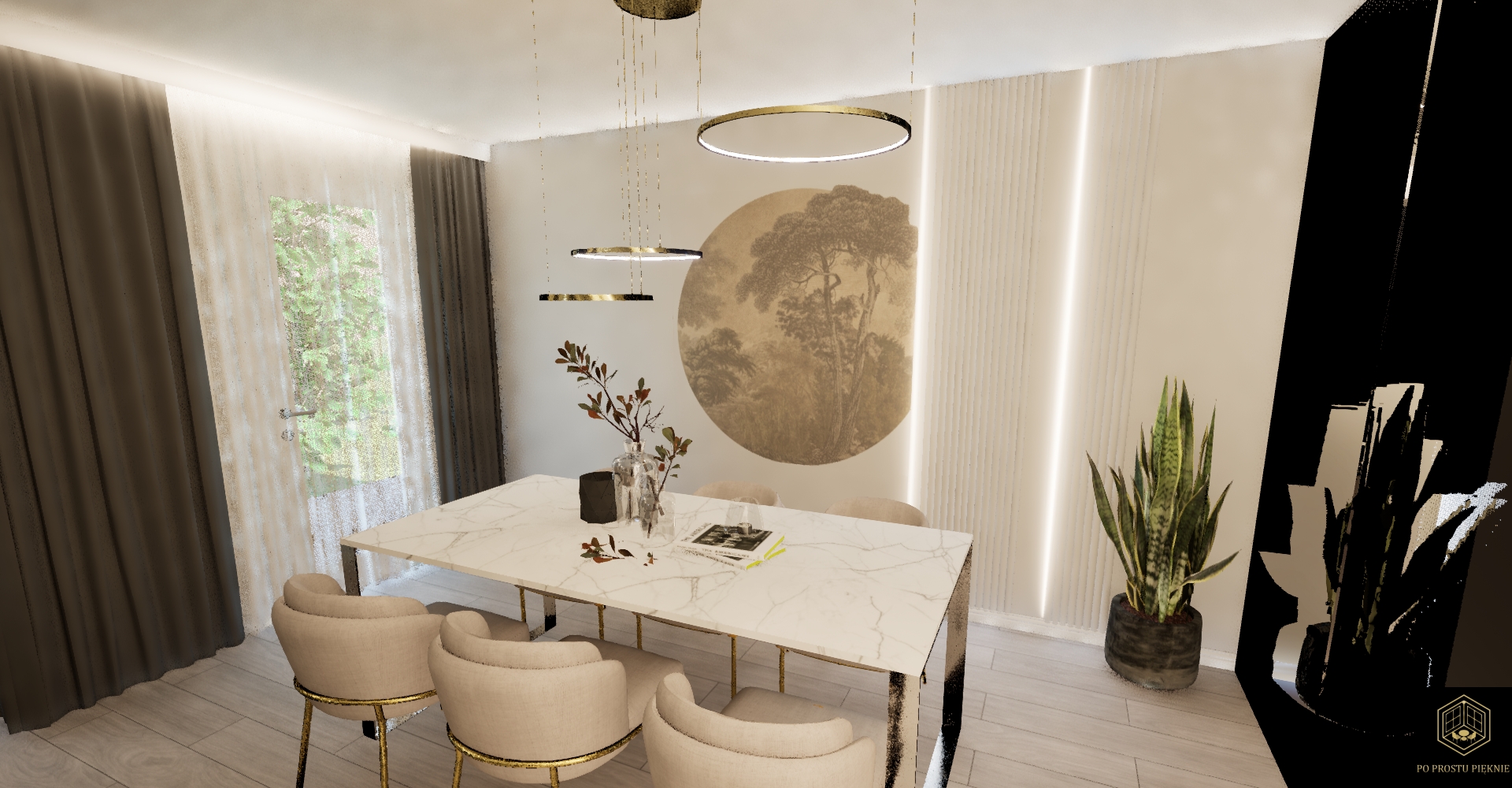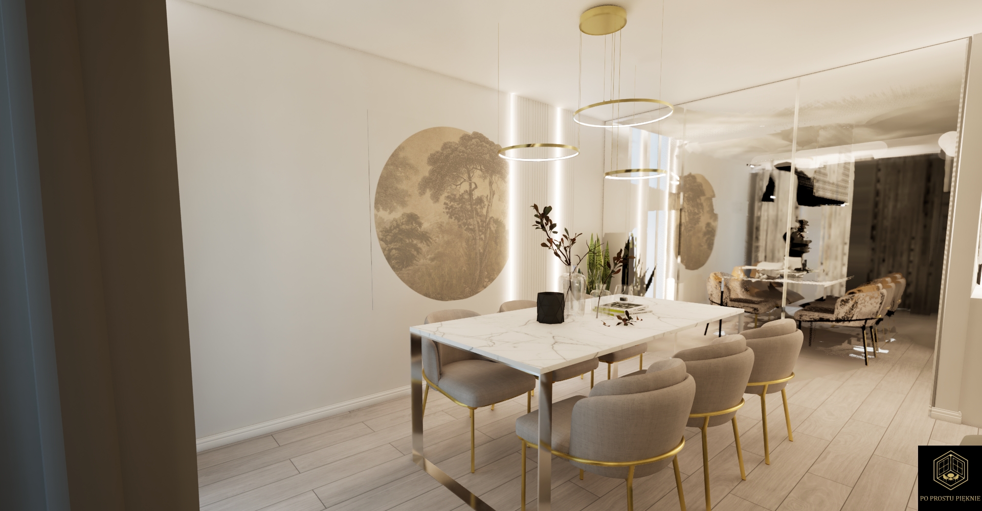 Po lewej stronie od salonu zaprojektowano nowoczesną jadalnię, której sercem jest stół z marmurowym blatem. Struktura marmuru, subtelnie żyłkowana, nawiązuje stylistycznie do wystroju łazienki, tworząc przemyślaną i spójną całość. Złote nogi stołu dodają elegancji i prestiżu, a ich połysk pięknie odbija światło.