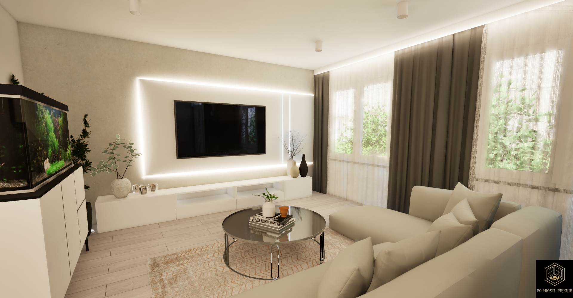 Na środku salonu znajduje się okrągły stolik kawowy, który uzupełnia przestrzeń, nie przytłaczając jej. Całość dopełnia telewizyjna ściana z podświetleniem LED, zaprojektowana w duchu minimalizmu – znajduje się tu jedynie prosta, elegancka szafka RTV, która pozwala ukryć sprzęt, nie zaburzając estetyki wnętrza.