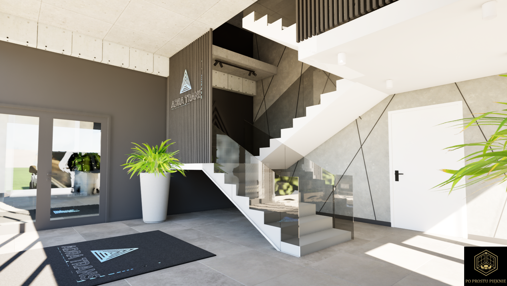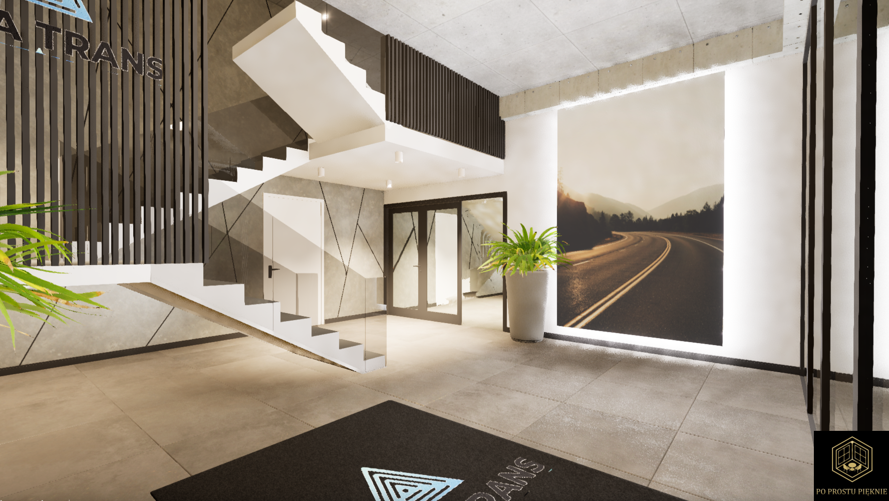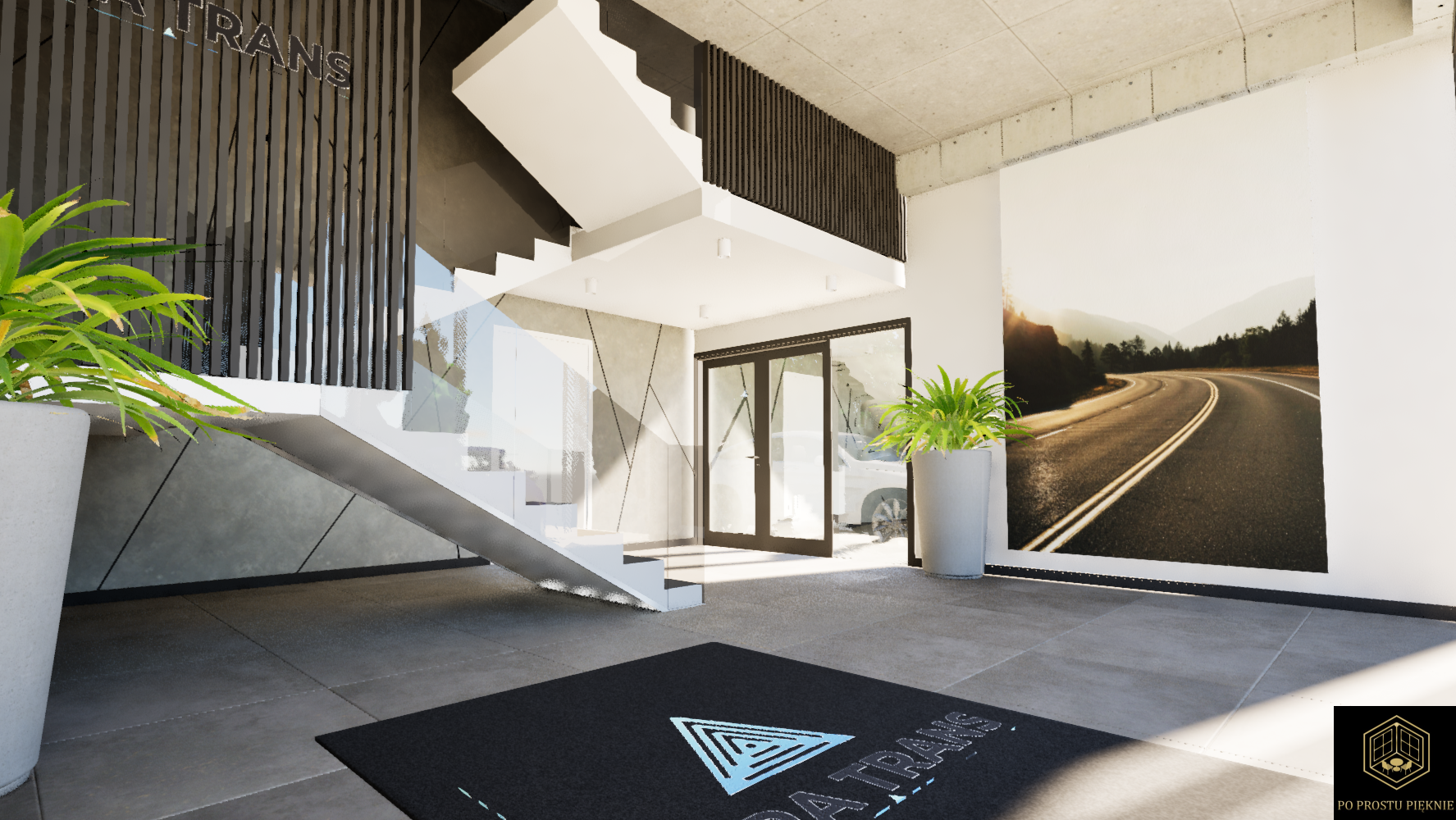 Wizja holu i klatki schodowej firmy transportowej łączy w sobie nowoczesność, funkcjonalność oraz wyraźne nawiązania do profilu działalności.  Kolorystyka i kontrastowe wykończenie wprowadzają gości w atmosferę biznesową i profesjonalizmu, zgodnie z charakterem firmy.