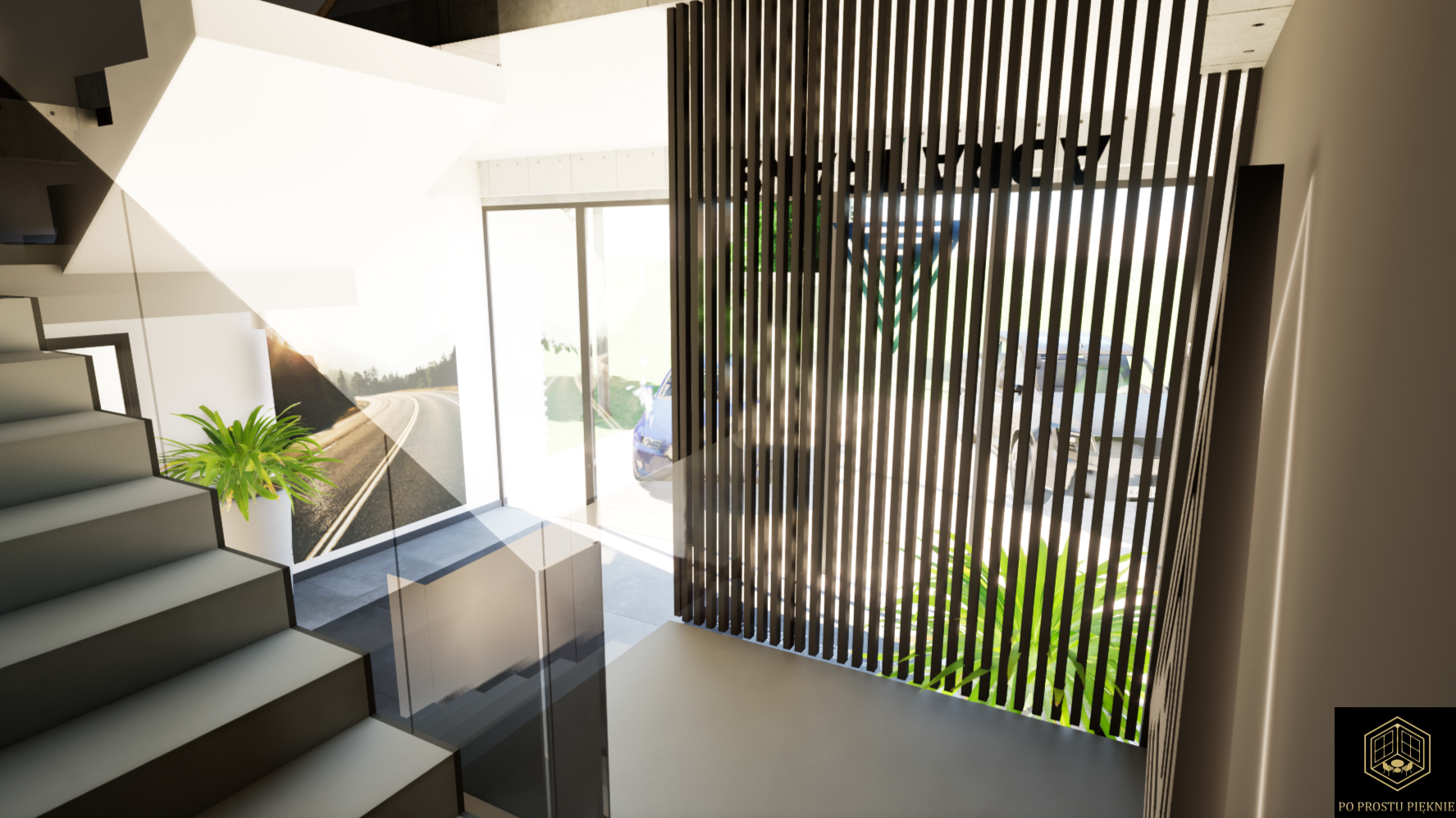 Już przy wejściu do budynku, uwagę przyciąga ciemna, kontrastowa ściana po lewej stronie, która dodaje elegancji i dynamiki. Przemieszczając się dalej, spostrzegamy przeszklone schody, których balustrada wykonana jest z przyciemnianego szkła, co nadaje im lekkości i nowoczesnego wyglądu. Przejrzystość szklanej balustrady wprowadza do wnętrza przestrzeń i światło, jednocześnie podkreślając elegancję i nowoczesność aranżacji.