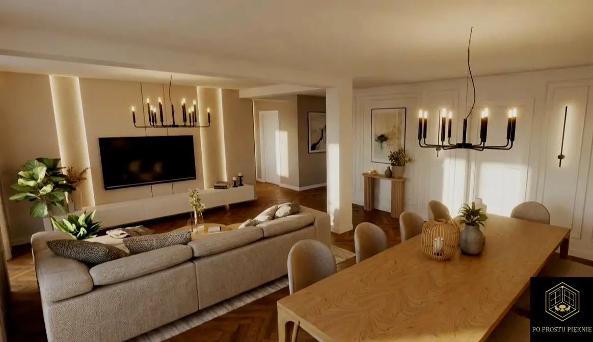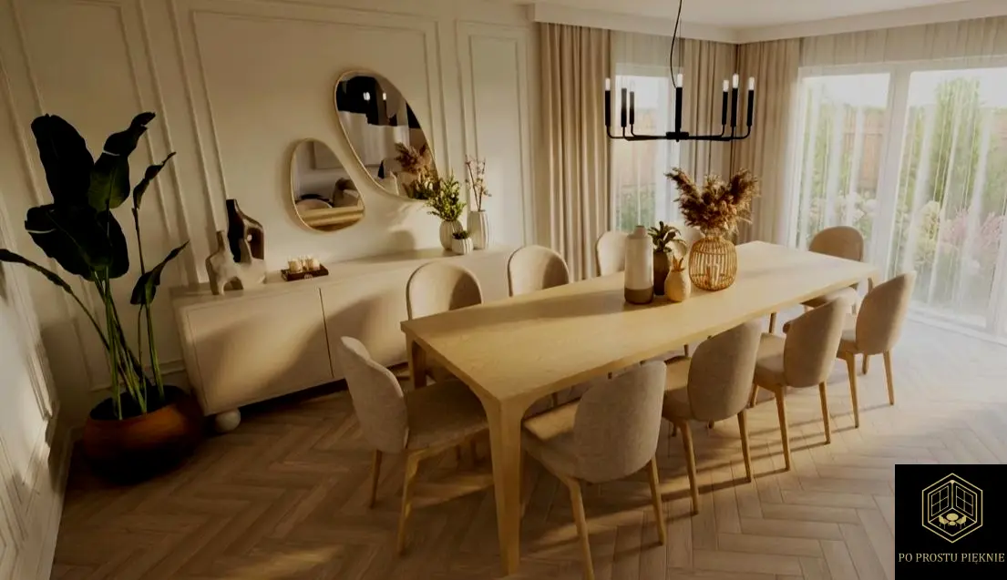 W centrum projektu postawiłam na integrację. Priorytetem był duży stół na 8 krzeseł, przy którym toczy się życie rodzinne, oraz niezwykle wygodna strefa relaksu z telewizorem. Aby nie przytłaczać wnętrza zbędnymi podziałami, zaproponowałam ukryte drzwi typu filomuro, które zlicowałam ze ścianą i pokryłam dekoracyjną tapetą o subtelnej strukturze.