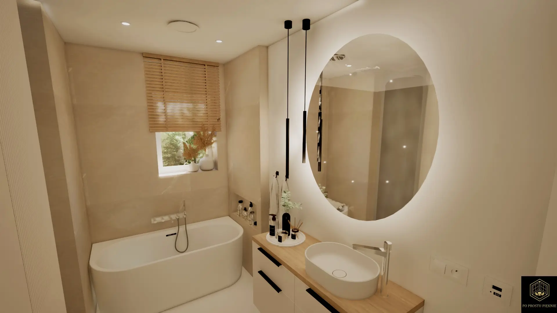 Projekt łazienki jest naturalną kontynuacją estetyki salonu. Chciałam, aby to pomieszczenie stało się prywatną oazą spokoju. Głównym elementem jest duża, wygodna wanna, idealna do długich kąpieli po pracy. Aby zachować minimalistyczny charakter i uniknąć wizualnego chaosu, zaprojektowałam pełną zabudowę stolarską z ukrytymi szafkami. Dzięki temu wszystkie przybory toaletowe i sprzęty są niewidoczne, a wnętrze pozostaje nieskazitelnie czyste w formie. Oświetlenie liniowe LED umieszczone pod szafkami i w niszach nadaje wnętrzu lekkości i tworzy nastrojowy klimat, który sprzyja wyciszeniu.