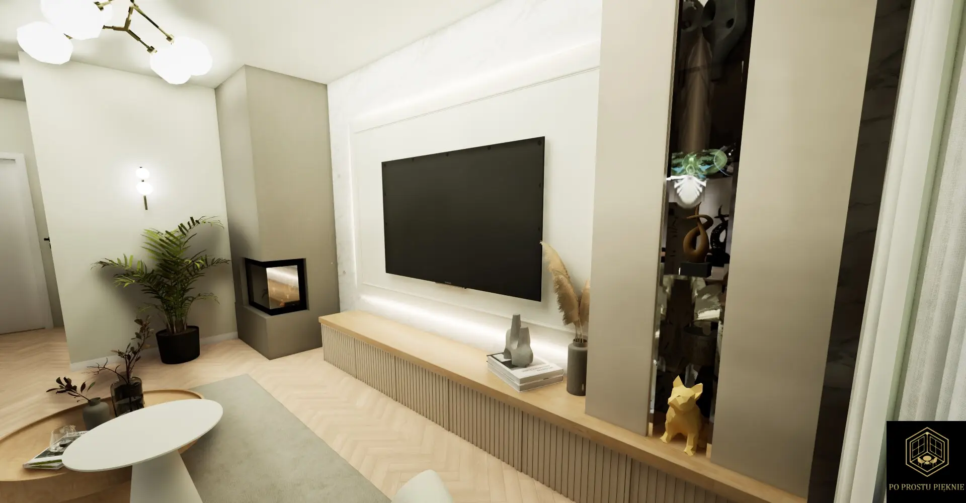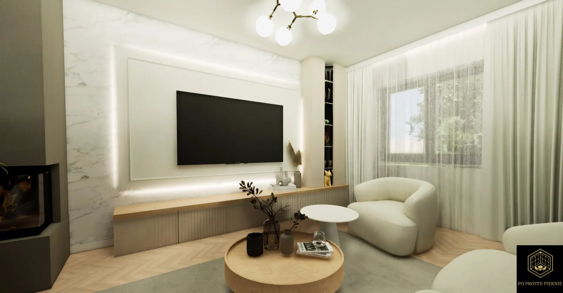 Salon jest sercem tego projektu, łącząc elegancję z funkcjonalnością. Centralnym punktem przestrzeni jest kontrastowy kominek wykończony kamieniem, który dodaje wyrazistości wnętrzu. Towarzyszy mu marmurowa ściana telewizyjna wzbogacona o delikatną sztukaterię, idealnie podkreśloną oświetleniem LED. Ryflowana zabudowa RTV z witryną to połączenie praktyczności i estetyki, nadając nowoczesny charakter tej przestrzeni. Sztukateria na ścianie telewizyjnej subtelnie łączy się z wystrojem jadalni, tworząc spójną stylistykę wnętrza.