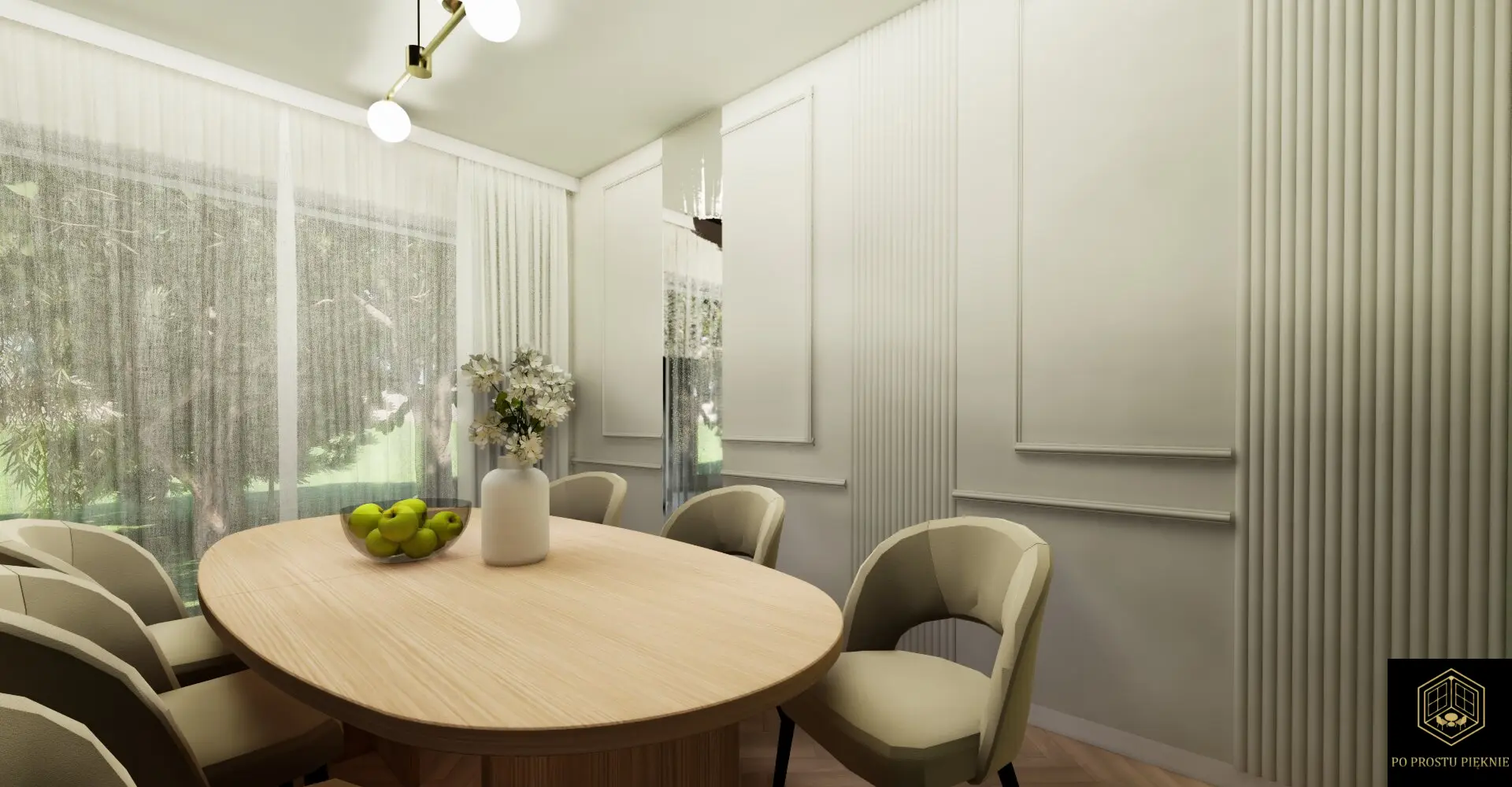 W jadalni główną rolę odgrywa duży, rozkładany stół, który zapewnia wygodę podczas codziennych posiłków i większych uroczystości. Na ścianie znajduje się unikalna kompozycja składająca się ze sztukaterii, ryflowanych paneli oraz lustra. Taki układ optycznie powiększa przestrzeń, dodając jej głębi i elegancji. Złote akcenty w oświetleniu oraz subtelne detale harmonizują z resztą wnętrza, podkreślając luksusowy charakter aranżacji.