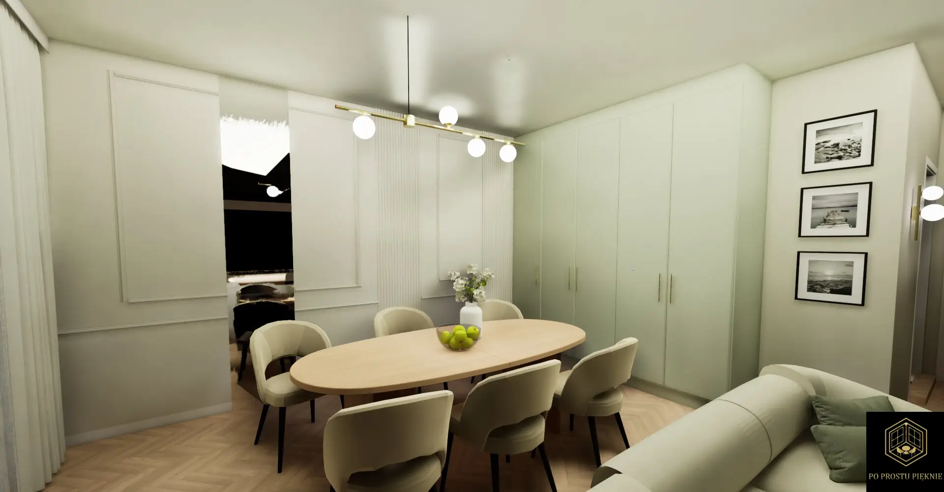 W całym projekcie zastosowano drewnianą podłogę ułożoną w jodełkę, która wprowadza ciepło i ponadczasową elegancję. Złote dodatki, takie jak lampy, uchwyty czy stoliki kawowe, stanowią subtelny akcent, nadając wnętrzu luksusowego wyrazu. Projekt wyróżnia się dbałością o szczegóły, spójnością oraz wykorzystaniem wysokiej jakości materiałów, które gwarantują trwałość i estetykę.